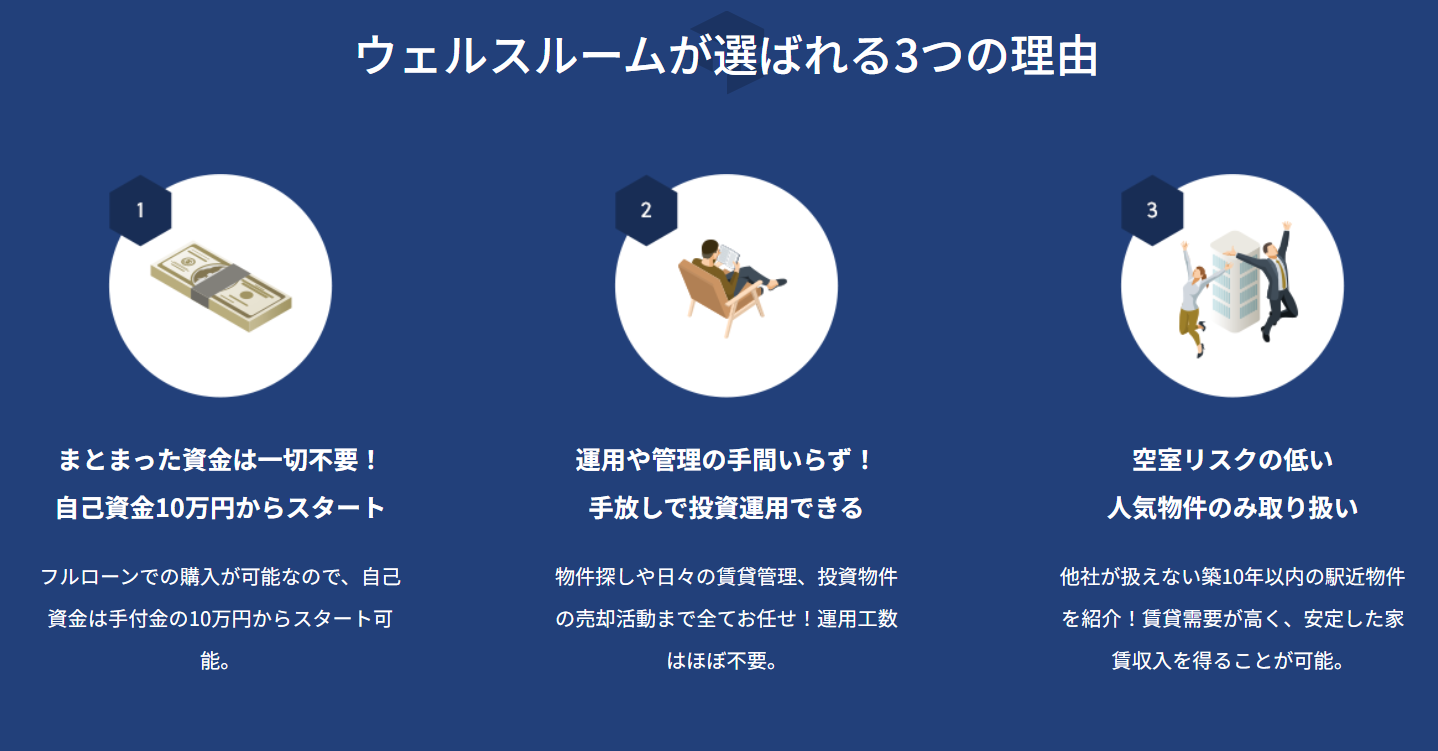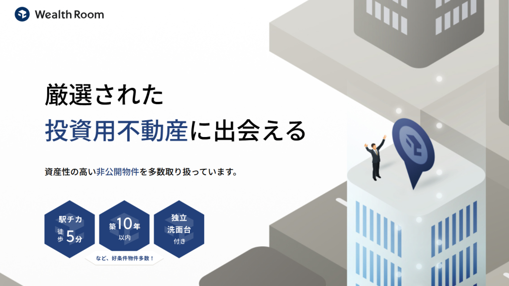 **Wealthroom(ウェルスルーム)**は、数ある投資用不動産の中から、本当に価値のある物件だけを厳選して紹介する不動産マッチングサービスです。