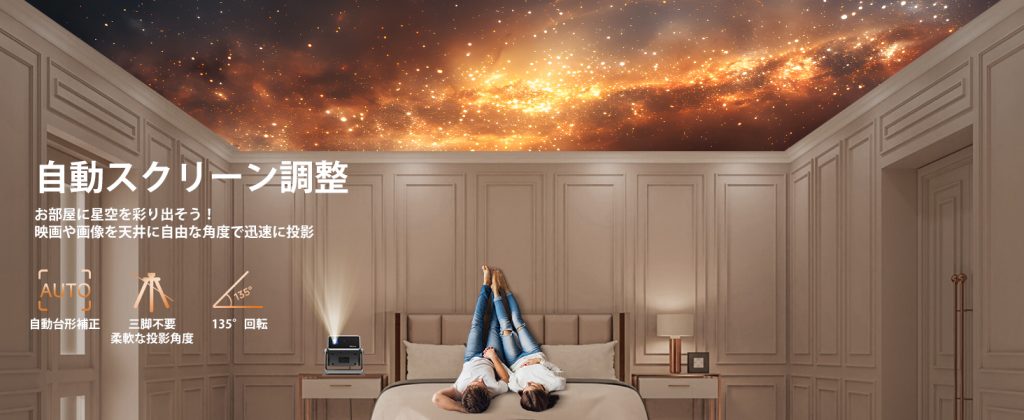 このモデル最大の魅力は135°の回転機能。壁や天井など、好きな場所に角度を変えて投影可能です。またジンバル一体型の設計で安定感が抜群。映像のブレを抑え、快適な視聴環境を実現しています。