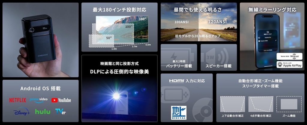 | CINEMAGE mini 2024 | Android 11.0 | 天井投影OK | Netflix/Disney+公式対応 | ◎(超小型) | 約39,800円 |
