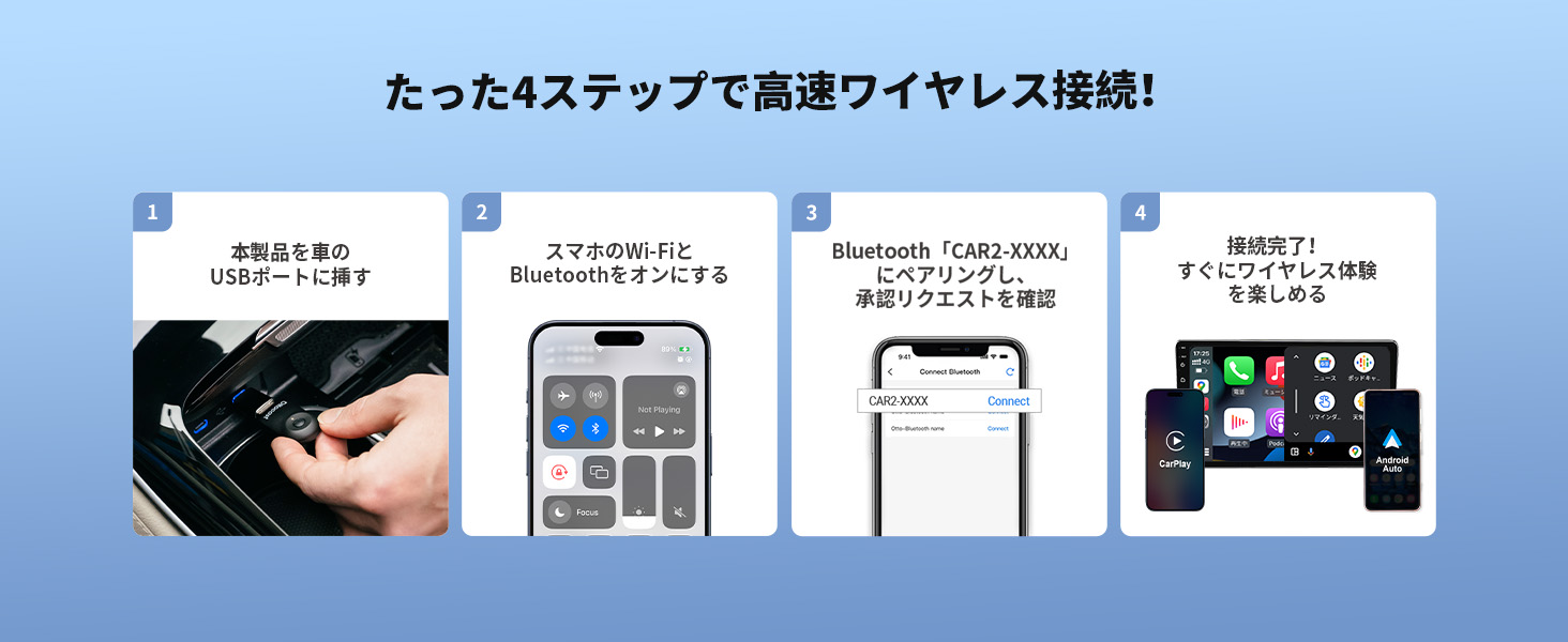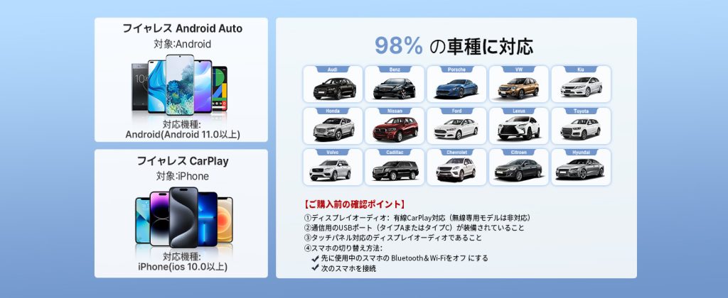 - 純正有線CarPlay/Android Auto対応車をワイヤレス化