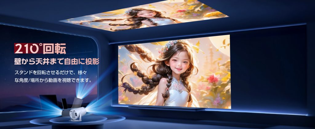 このプロジェクターは、270°回転機能を搭載しており、自由自在に映像を投影できます。天井投影や壁投影も可能で、シーンに合わせて最適な角度に調整できます。