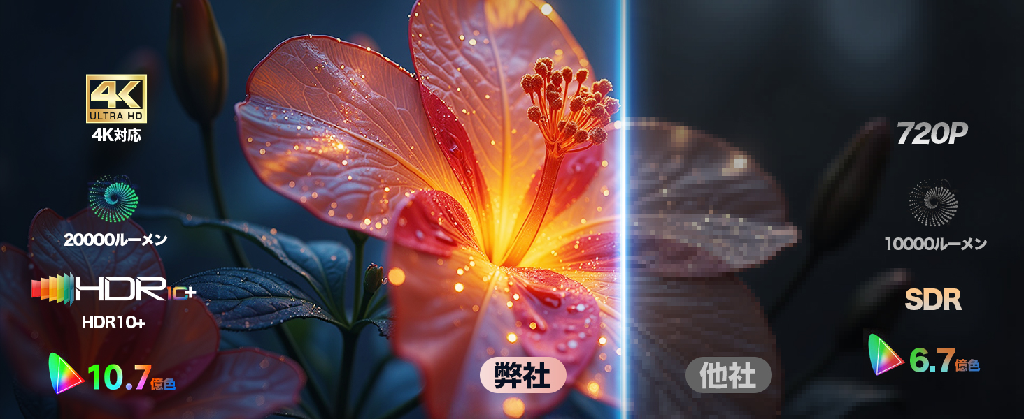 20000ルーメンの高輝度を実現し、昼間でも明るく鮮やかな映像を楽しめます。特に家庭用としては十分な明るさで、リビングや寝室にぴったり。