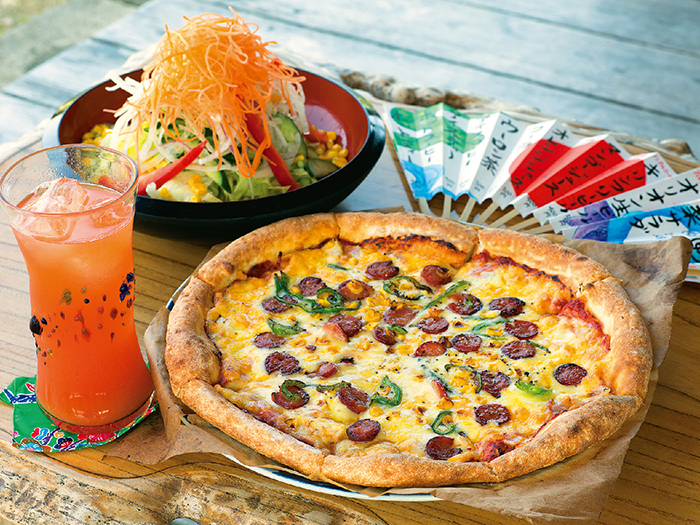 海を一望する高台に建つ、古民家風ピザカフェ。手ごね生地のチーズたっぷりピザと、本部産アセロラジュースの組み合わせは格別です。
