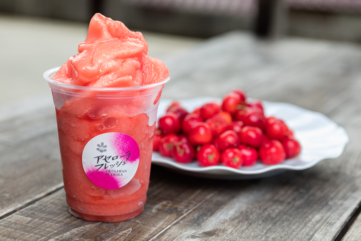 本部町の海沿いに佇む、日本で唯一のアセロラ専門店。自社農園で育てたアセロラを100%使ったジュースやスムージーは、まさに沖縄の太陽を感じる味!