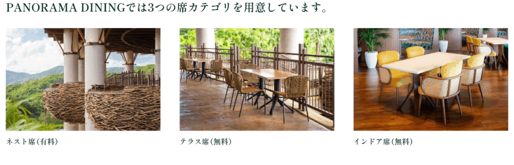 💺 席種:ネスト席(有料)/テラス席・インドア席(無料)