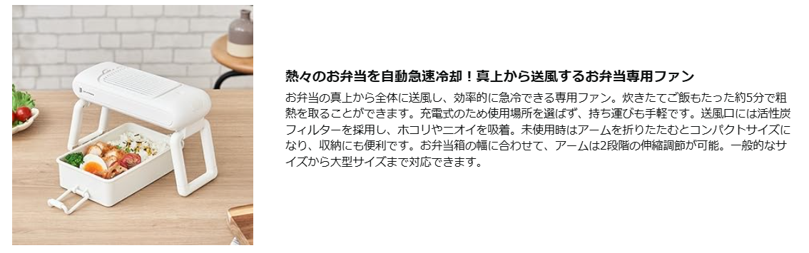 最大の魅力は、お弁当箱の熱をすばやく冷ましてくれる「自動急速送風機能」。