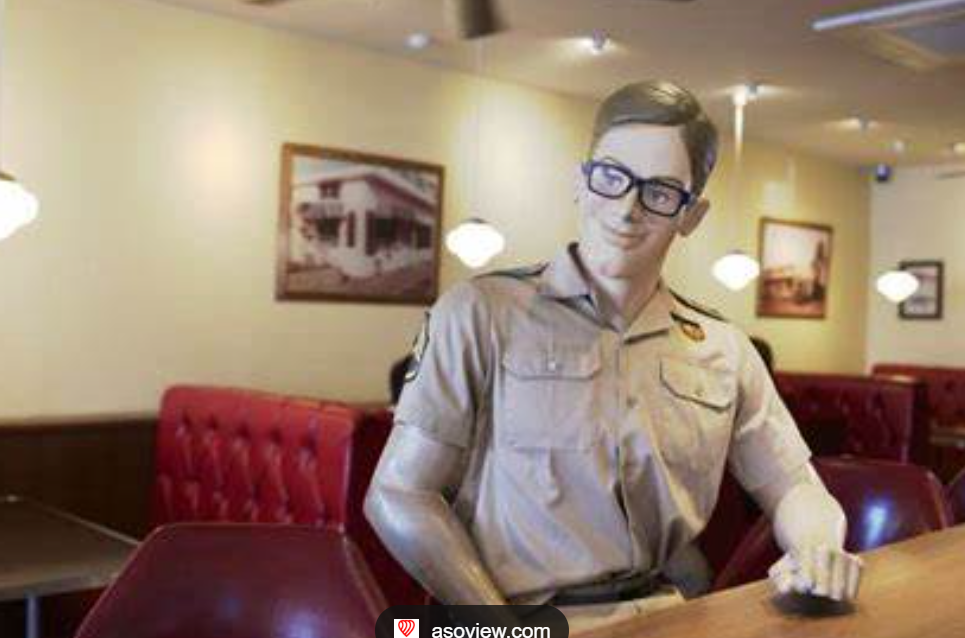 旧本店のカウンター席にいたマスコット「ジョニーさん」は、リニューアル後2階に移動。鏡越しの撮影もでき、ユニークな写真が撮れます。