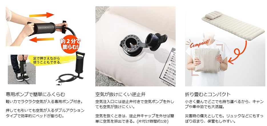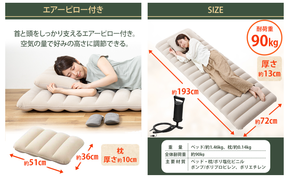 エアーベッド選びで最も重要なのは、「空気を入れる手段がセットかどうか」です。本体だけ安く買って、後からポンプを別で買うと、結局高くついたり、サイズが合わなかったりします。