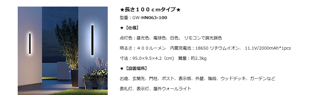 | GWSOLAR GW-HN063-100 | 400lm | ○(調色可) | 最大8時間 | ○ | IP65 | 100cmロングで広範囲照射 |