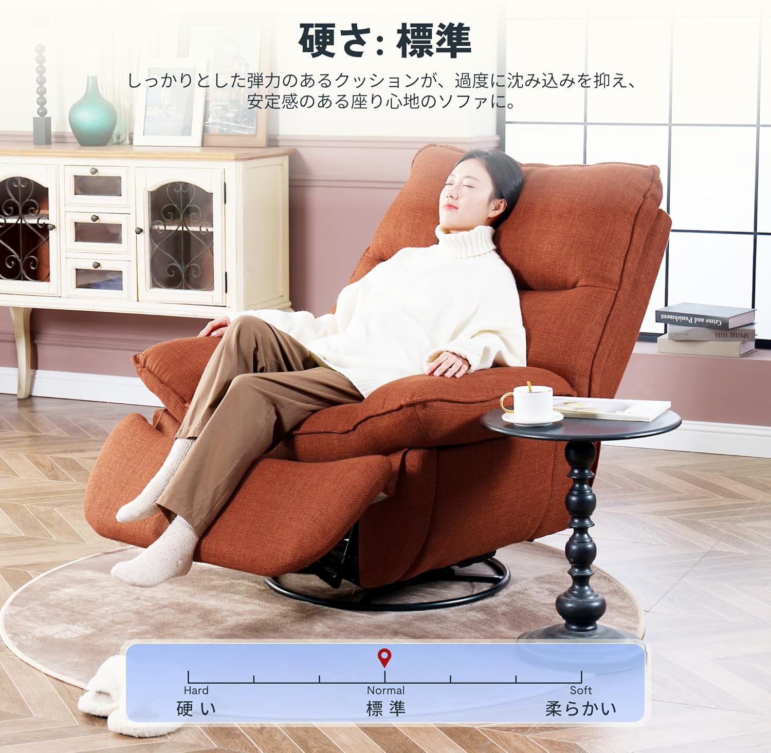 この一人用リクライニングソファーは、映画や読書、昼寝などを快適に過ごせるための機能が盛りだくさん。特にスイベル・ロッキング機能付きで、自由に体勢を変えながらリラックスできます。