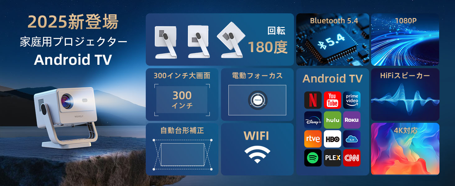 Amazon.co.jp: WISHOLY プロジェクター 家庭用【2025新登場!Android TV搭載・180°回転】プロジェクター天井投影 18000LM 1080P Wi-Fi 電動フォーカス 自動台形補正 ホームプロジェクター Bluetooth5.4 スタンド一体型 HiFiスピーカー内蔵 50%ズーム機能 操作簡単 ノートパソコン/スマホ/TVボックス/USB/PSゲーム機/DVDプレーヤーなど対応 : 家電&カメラ