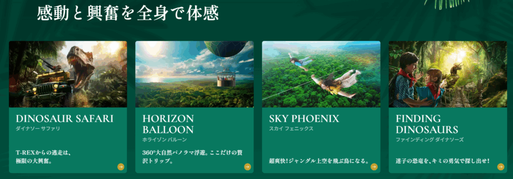 | 幼児(4才〜) | ダイナソーサファリ、ファインディングダイナソーズ、スプラッシュバトルなど(同伴必須) |