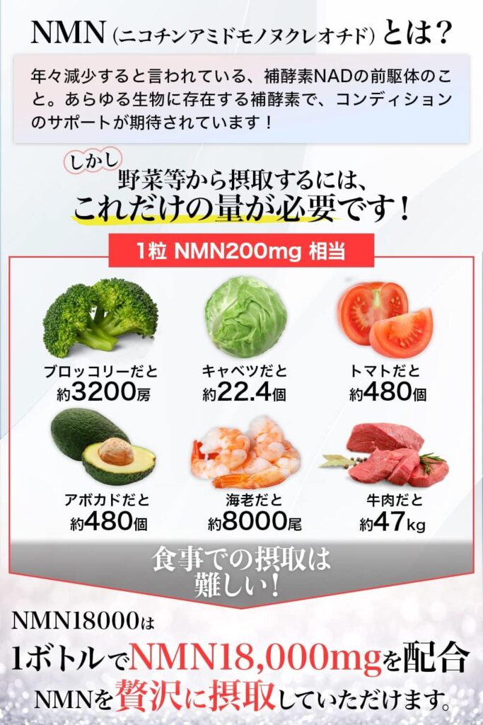 | NMN含有量 | 1粒あたり200mg(合計18,000mg) |