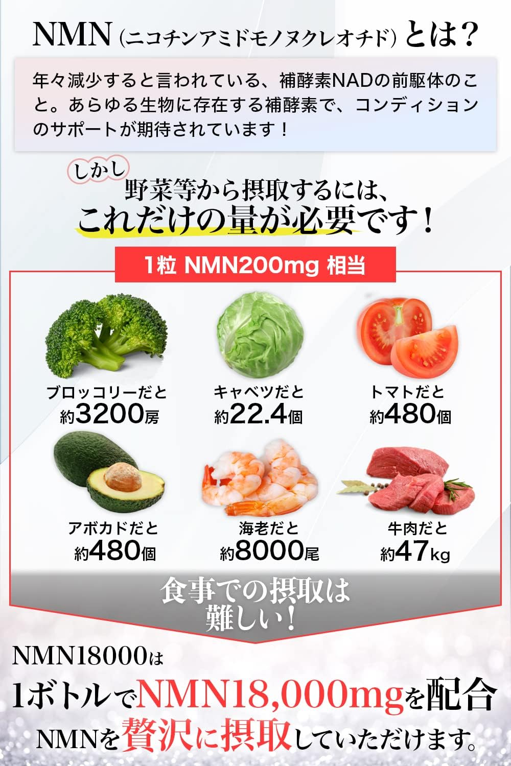 🌿 特徴①|NMNを1粒200mg配合!驚異の含有量と高純度