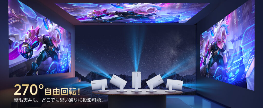 プロジェクター本体の**首振り機構(270°回転)**により、天井/壁/斜め面など、好きな角度で自由に設置可能。ベッドに寝ながら映画を観るスタイルにもぴったり。