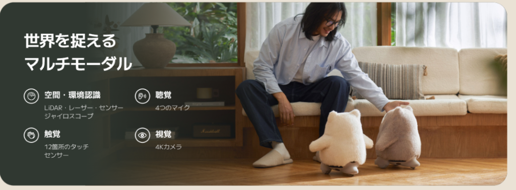 - 12箇所の高度なセンサー: 頭を撫でる、抱きしめる、耳に触れるといった触れ合いを全身で感知。