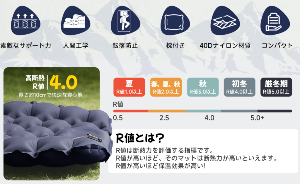 • R値4.0: 地面からの熱の伝わり(冷気)を抑える指標。3シーズン+αで活躍します。