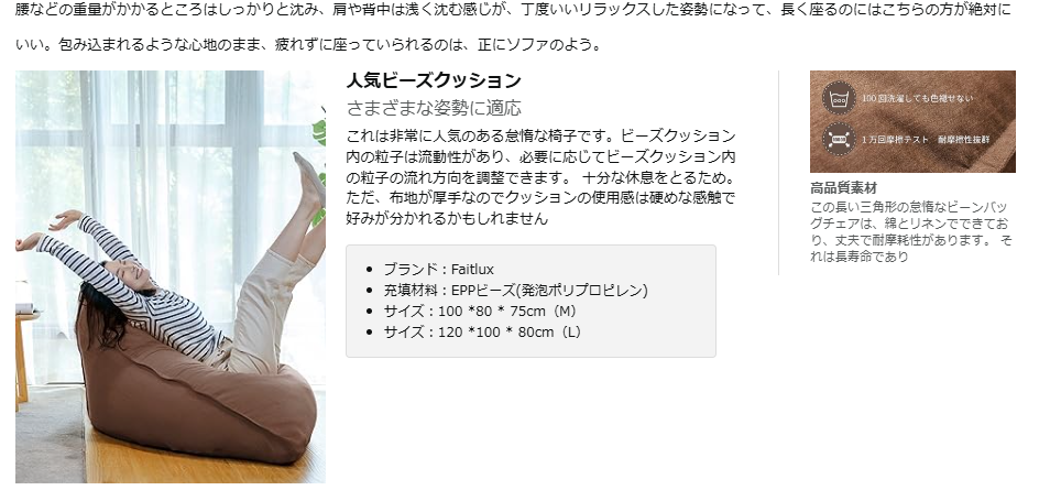 • ニオイが気にならない: 海外製の安価なビーズクッションにありがちな、化学薬品のような臭いがありません。