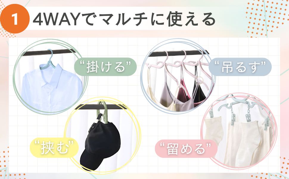 最近ではピンチ付き・マルチWAY設計のタイプもあり、「干す」「吊るす」「まとめる」など多用途に活躍!