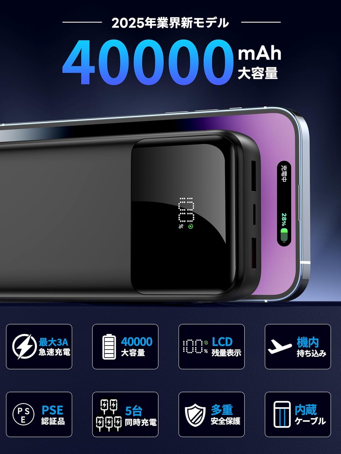 40000mAhという大容量により、iPhone、Android、タブレット、ゲーム機など複数台を何度も充電できます。