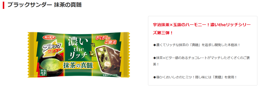 従来のブラックサンダーとは一味違う、上品な抹茶風味が特徴。