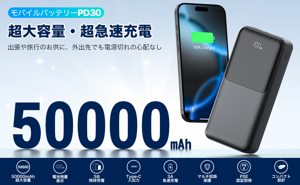 50000mAhという数字は、一般的なスマホ(3000〜4000mAh)で10〜15回以上のフル充電が可能です。