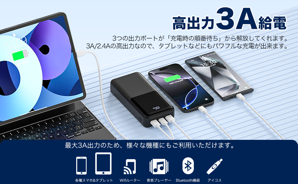 スマホ + タブレット + イヤホンなど、複数の機器を同時に充電可能です。