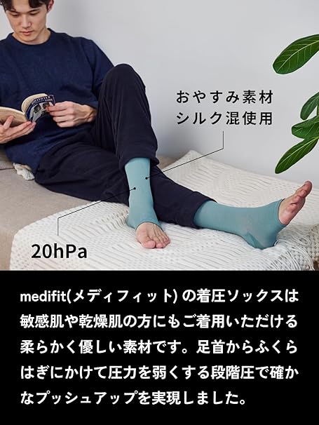 毎日の忙しさで疲れが溜まりやすい脚。特に立ち仕事や座りっぱなしの時間が多い方には、脚のむくみや疲れが気になりますよね。そんな悩みを解決してくれるのが、Maison Peonyの【MEDIFIT 着圧ソックス おやすみ メンズ シルク混 夜用】です。シルク混素材のやさしい着圧で、睡眠中に脚をリフレッシュし、翌朝にはすっきりとした感覚を実感できます。