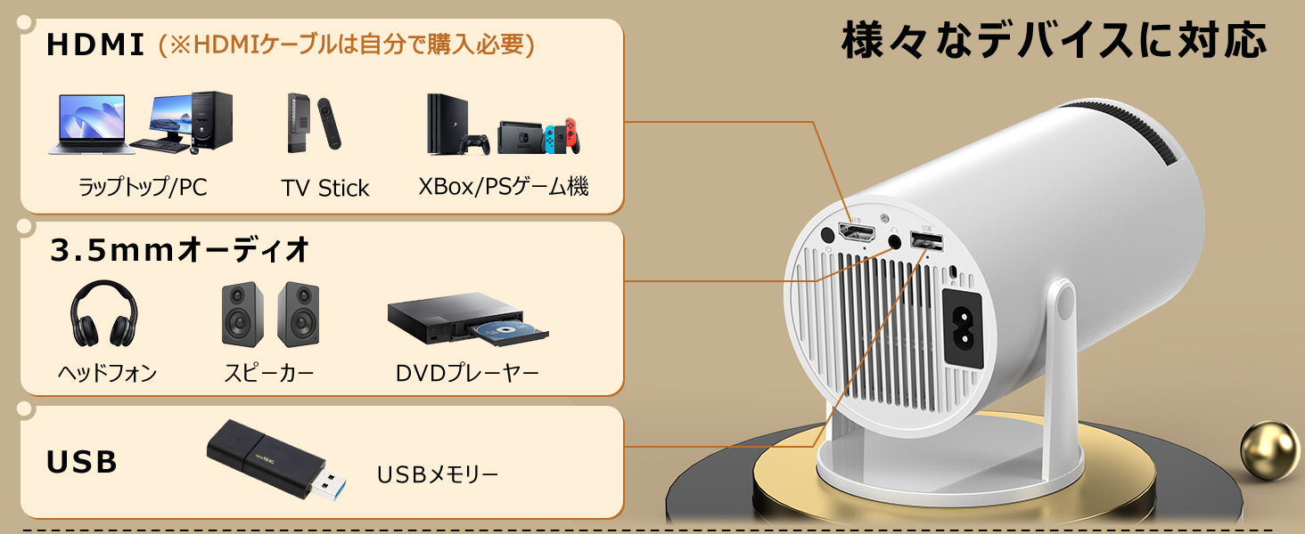 Wi-FiやBluetooth接続に加えて、HDMI、USB、3.5mmオーディオポートも装備しており、PC、DVDプレーヤー、タブレット、USBストレージ、PSゲーム機、スピーカー、ヘッドフォンなど、さまざまなデバイスと互換性があります。また、革新的な冷却ファンと放熱設計により、80,000時間以上の超長寿命を実現しています。