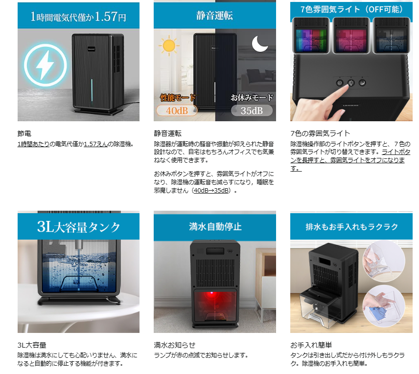 - 「コンパクトなのにしっかり除湿してくれる。脱衣所がカラッとして助かる」