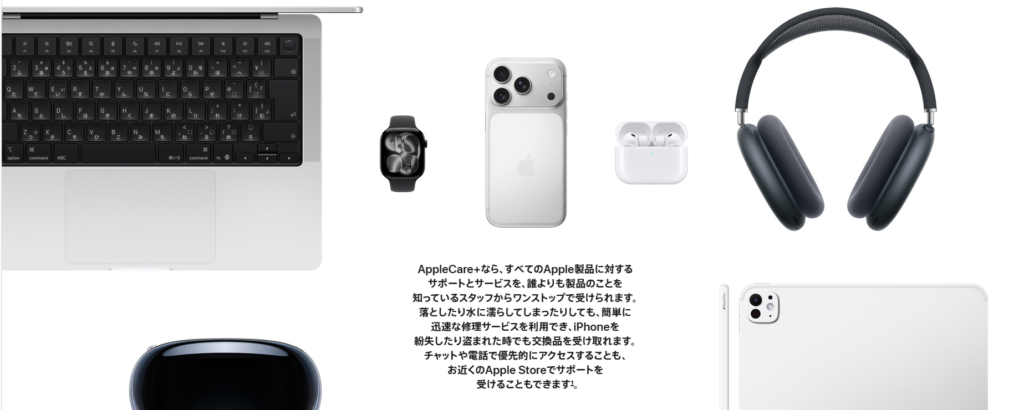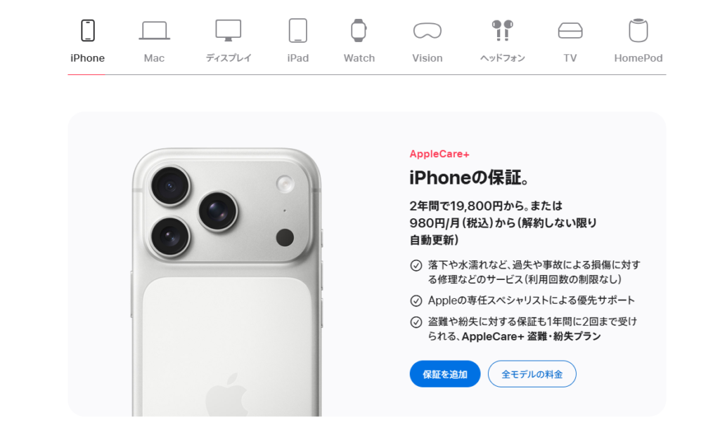 • Apple Vision Pro: 修理費が極めて高額(数十万円単位)になるため、加入必須。