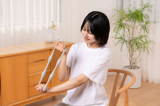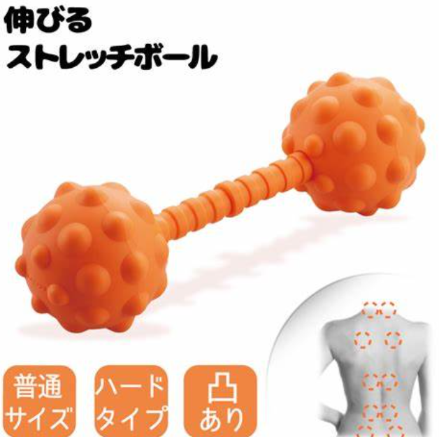 伸縮自在のストレッチボールは、肩甲骨やその他の筋肉のコリをほぐすために使用されます。ボールの幅を調整できるため、さまざまな部位に対応可能です。