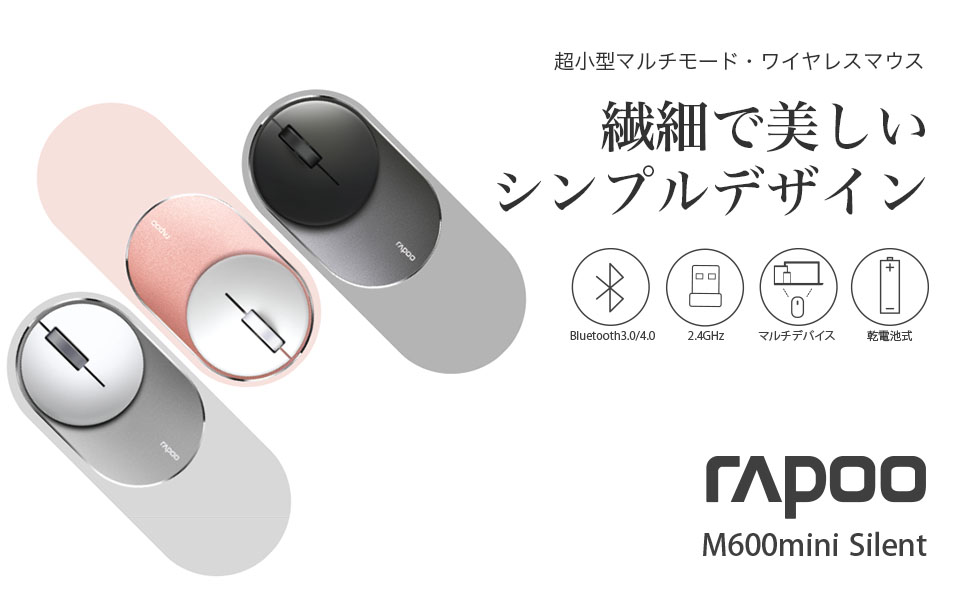 こちらのマウスは、その名の通り超小型設計ながら、驚くほど高機能で、多くのデバイスに対応。Bluetooth2.4GHzの両方の接続方式をサポートし、マルチデバイス対応で、PC、スマホ、タブレットなど、複数のデバイスを簡単に切り替えて使用できます。コンパクトでありながら、操作性と利便性を両立させた、このRapoo M600miniマウスの魅力をご紹介します。