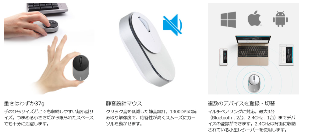 このマウスの最大のポイントは、Bluetooth接続2.4GHzワイヤレス接続の両方に対応しているところです。Bluetooth接続なら、USBポートを占有せずにデバイスと接続でき、2.4GHzワイヤレス接続では、専用のUSBレシーバーを使って、安定した接続を実現。さらに、マルチデバイス対応なので、PC、スマホ、タブレットなどの間で簡単に切り替えが可能です。
