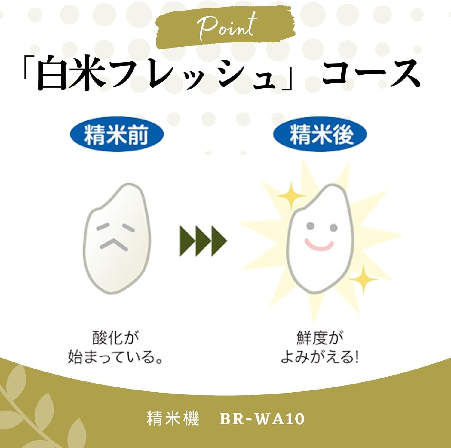 - 胚芽米モード:胚芽部分を残してビタミンやミネラルを多く含む栄養豊富なお米が完成。