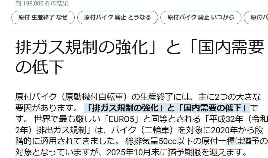 - 排ガス規制の強化により、50cc原付の製造が難しくなったことが背景にあります。