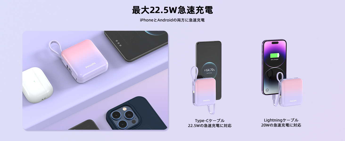 - Lightning(iPhone) と Type-C(Android) の2本が内蔵