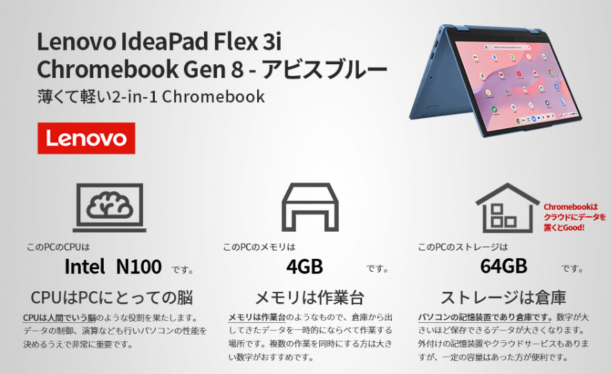 私もそうでした。プロブロガーとして活動する中で、メインのデスクトップPCとは別に「ソファで寝っ転がりながら記事の下書きができる」ような、それでいて動作がもっさりしない手軽な一台を探し求めていたんです。そんな時に出会ったのが、Lenovo Chromebook IdeaPad Flex 3i Gen8でした。
