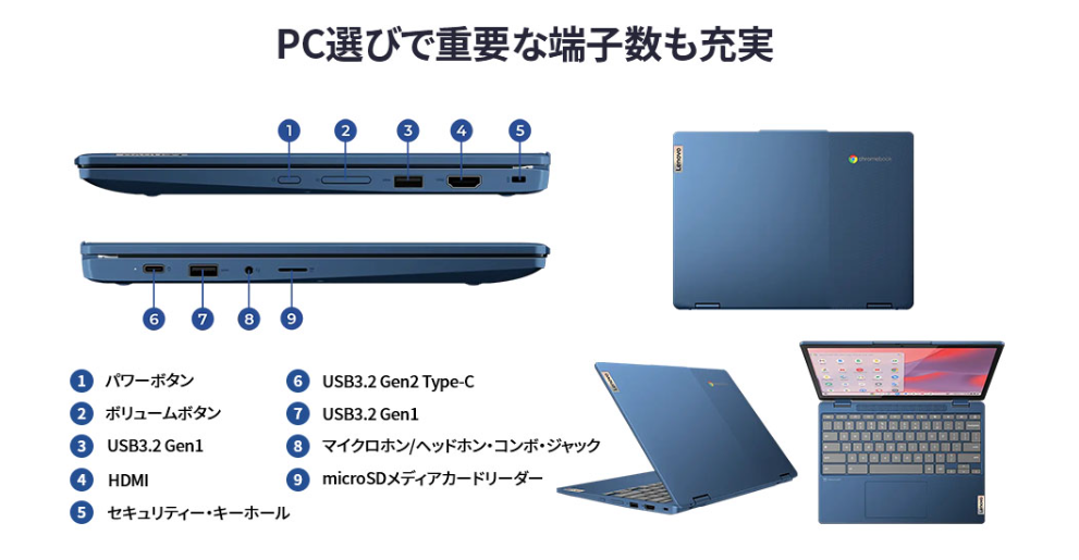 このモデルは、Lenovoが展開する「IdeaPad」シリーズの中でも、特にコストパフォーマンスと汎用性に特化した2in1タイプのChromebookです。