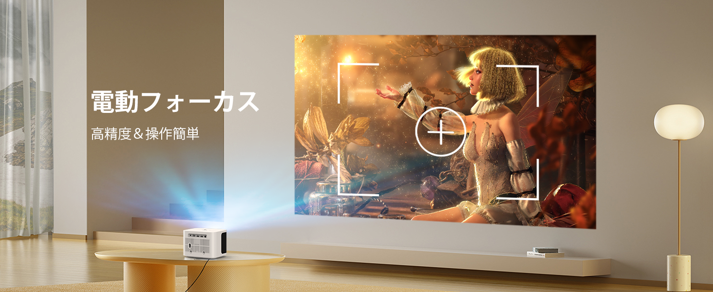小型プロジェクターにしては珍しく、電動フォーカス機能を搭載。リモコン操作だけで簡単にピント調整でき、設置後の微調整が非常にスムーズです。