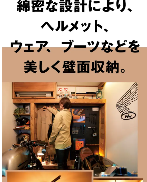 「バイク2台に加えて椅子やソファ、テーブルを置ける広さがあり、バイクを眺めながらくつろげるデザイン。」 ▶ 詳細はこちら
