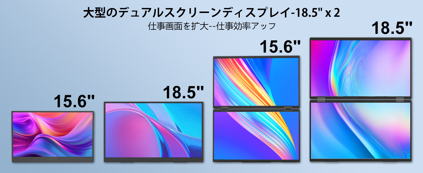 InnoView デュアル モバイルモニターは、18.5インチの大画面を提供し、フルHD(1920×1080)解像度で、鮮明でクリアな表示が可能です。動画視聴やオンライン会議、作業効率を向上させるためには、大きな画面があると非常に便利です。このモニターは、特に複数のウィンドウを同時に開いて作業する場合や、デザイン作業に最適です。