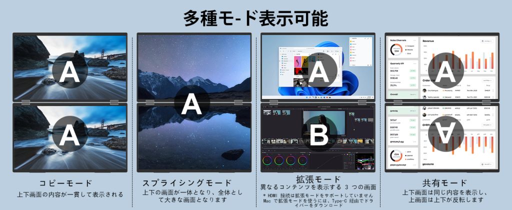 InnoView デュアル モバイルモニターは、PC・Mac両方に対応しており、幅広いデバイスと接続が可能です。Type-C接続とHDMI接続に対応しているので、ほとんどのデバイスに簡単に接続できます。これにより、デバイスを選ばずに使用できるため、非常に便利です。