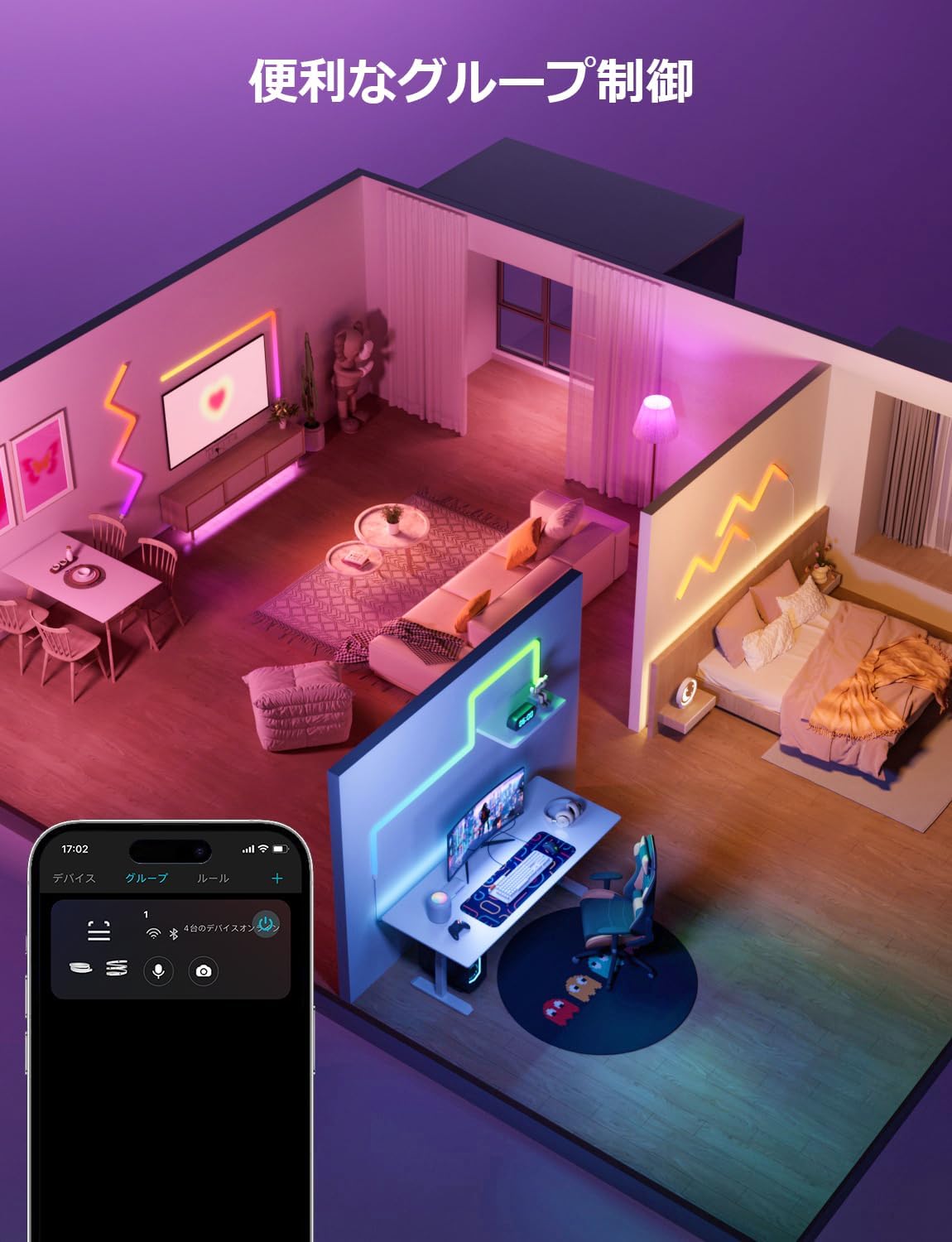 音声アシスタントに話しかけるだけで、ライトのオンオフ、明るさ調整、色変更が可能。「Alexa、ライトを消して」「Google、虹色にして」と言うだけで、操作が完了します。