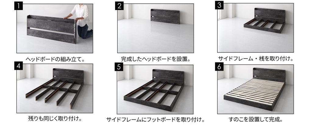 「組み立てがとても簡単で、説明書を見ながら約30分で完成しました。工具もちゃんと付いていて、特に迷うことなく作業できました。出来上がったベッドも素敵で、寝室が広く感じます。シンプルでスタイリッシュ、毎晩寝るのが楽しみです。」