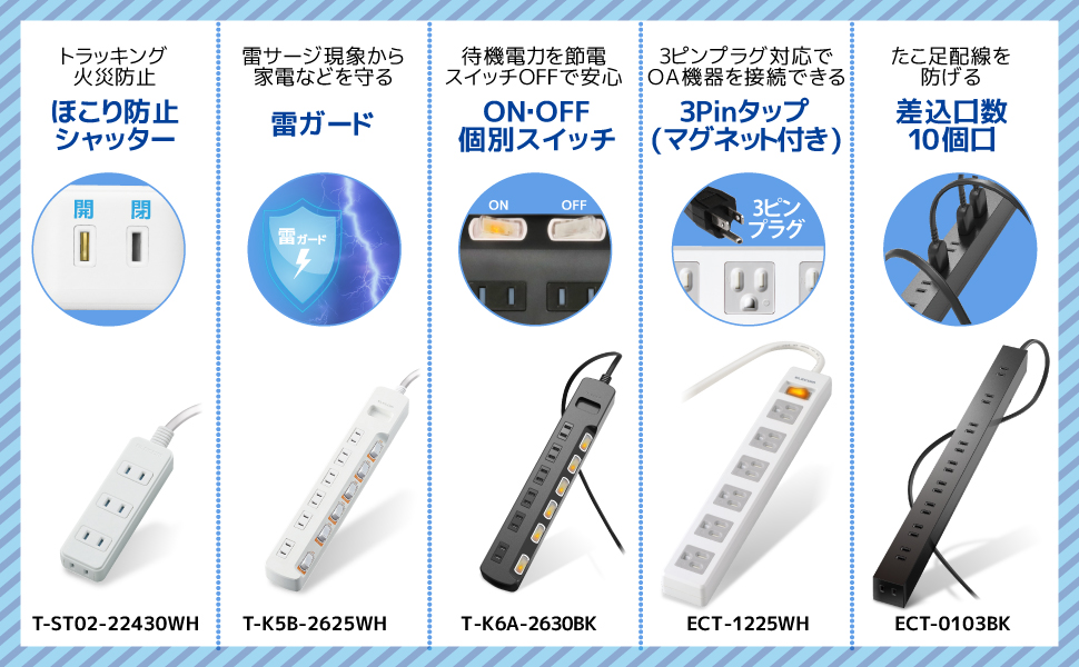 | 製品名 | 口数 | 雷ガード | 個別スイッチ | シャッター | ケーブル長 | 価格帯 |