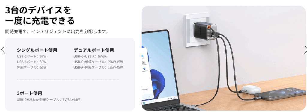 ✅ 最大67W出力でノートPCにも対応
