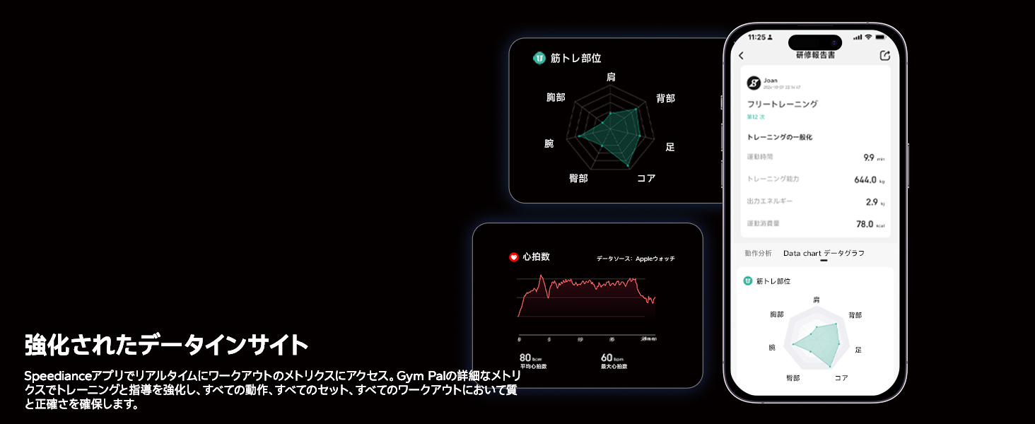 Speediance Gym Palの特徴の一つに、内蔵されたAIによるパーソナライズド指導があります。AIは、ユーザーが行っているトレーニングのフォームや負荷をリアルタイムで分析し、適切なフィードバックを提供します。例えば、以下のようなフィードバックが届きます。