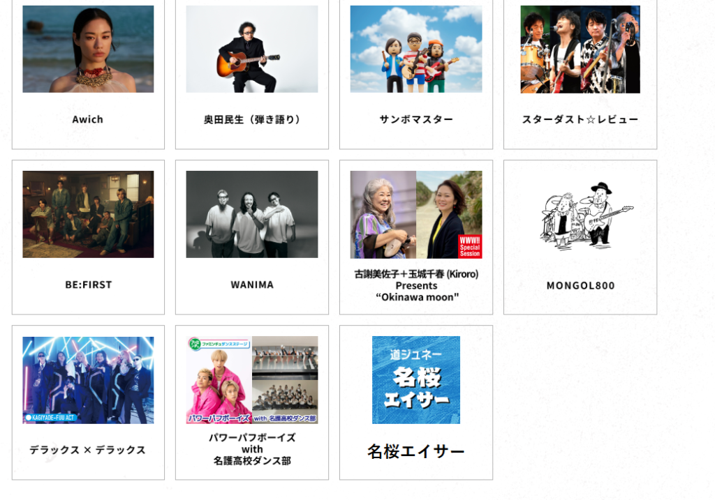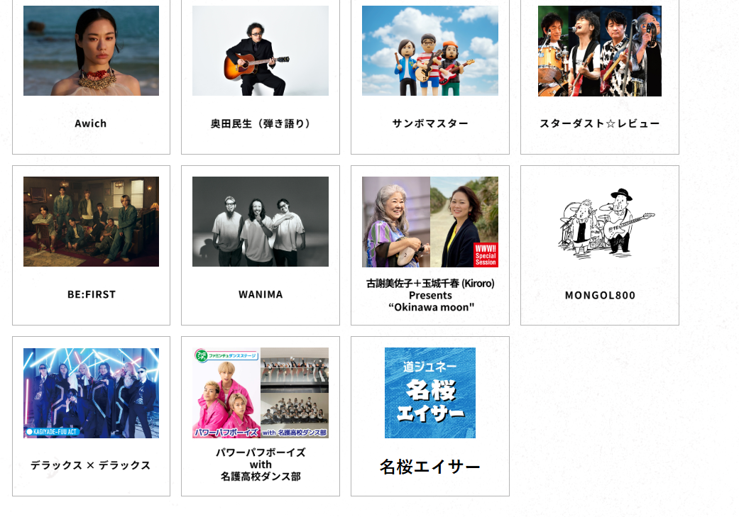 • 特徴: 地元沖縄のアーティストや全国からのゲストが集う音楽フェス。ローカル感溢れる雰囲気と、沖縄の自然を楽しめるフェスとして注目されています。