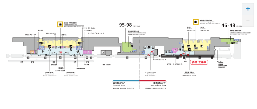 - 1F:到着ロビー・レンタカー受付・バス・タクシー乗り場